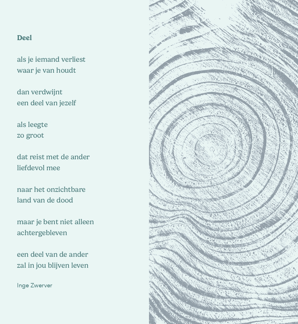 Het hele jaar door kun je gedichten van mij tegenkomen in verschillende landelijke dagbladen. Sinds 2023 publiceert DPG Media dichtregels bij familieberichten. Een mooi en troostend initiatief. Dit jaar zijn mijn gedichten 'Vast' en 'Water' al herhaaldelijk geplaatst.