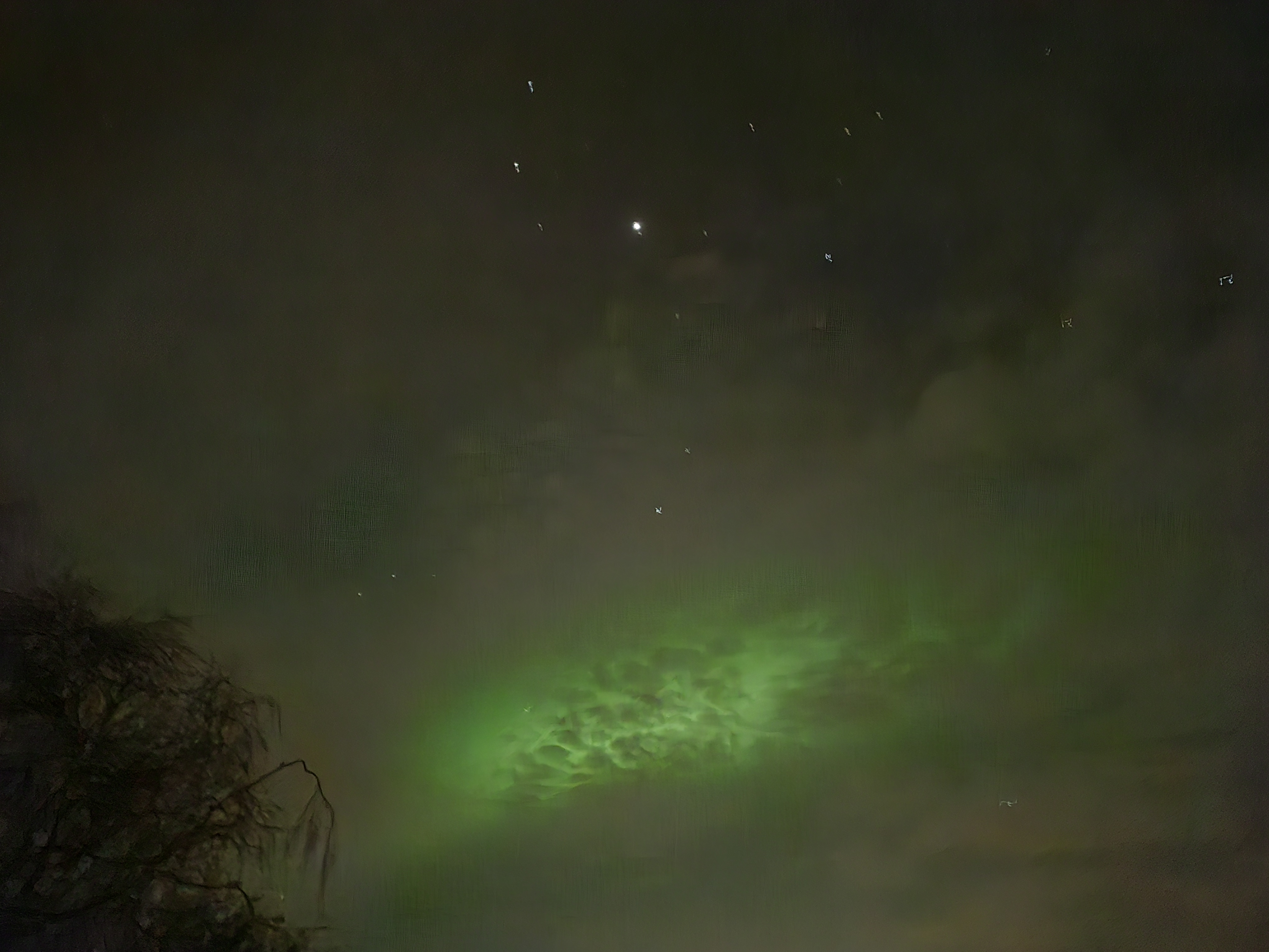 Vooral op maandagavond vond ik de ervaring spectaculair. Ik stond toen aan de Badweg, vlak bij mijn appartement. Ik had online gezien dat het Noorderlicht actief was. Ik heb wel vaker het Noorderlicht gezien, maar altijd wel via de scherm van mijn telefoon. Wat is het dan een wonderlijke ervaring als je ineens in de lucht het felle groen ziet. Als grote vlagen en lange slierten, die bewegen tegen de zwarte sterrenhemel. Ik raakte diep ontroerd en dacht: dit is veel groter en sterker dan de mens. Dit is magie!