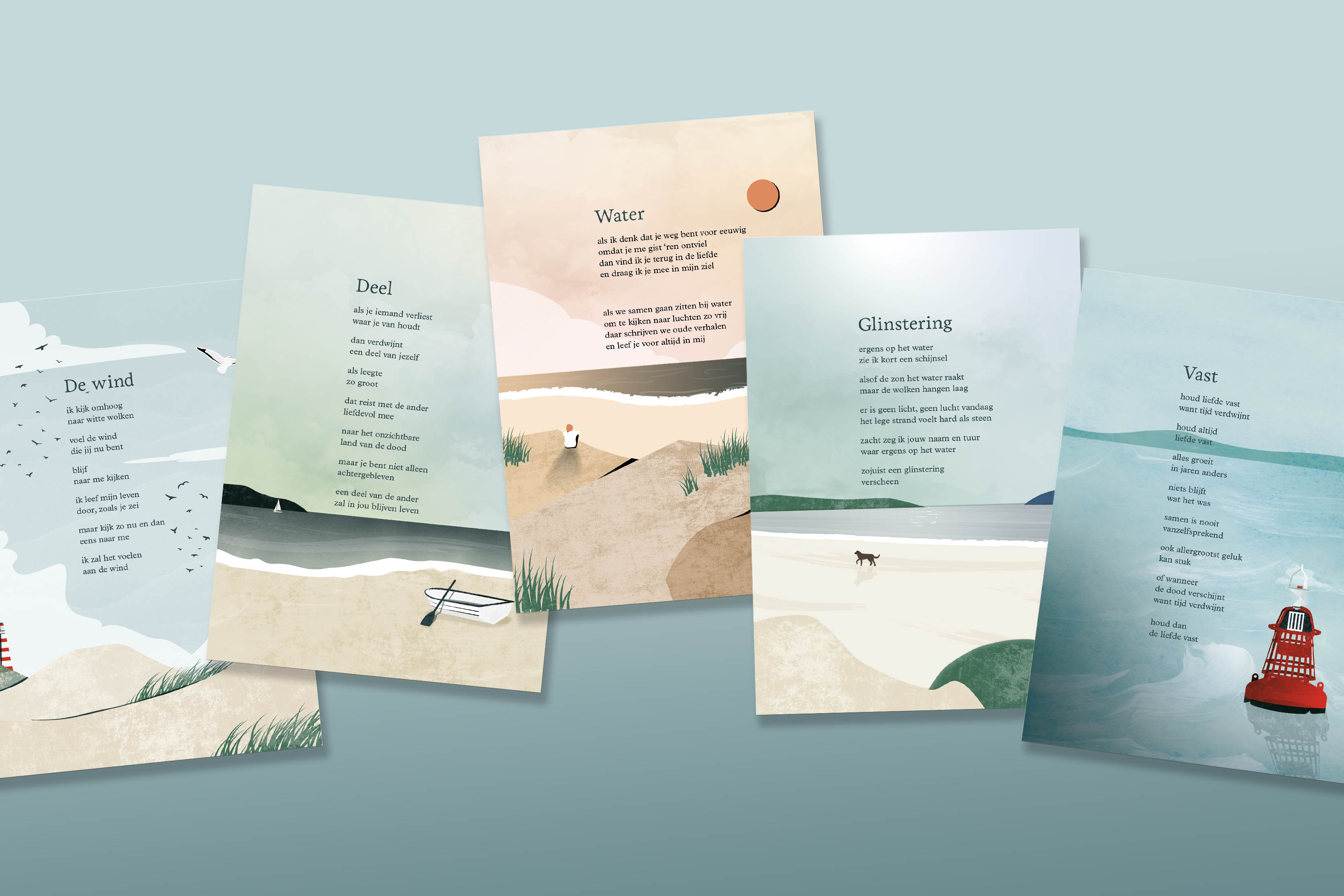 Een set van vijf verschillende Wadkaarten met gedichten en illustraties uit de nieuwe bundel 'Een zee van troost'.